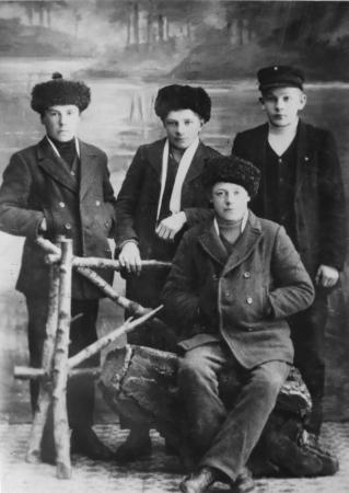 Från vänster Fritiof Nyberg, Verner Blomberg, okänd. Sittande Alfred Hjortman. 1920-talet.