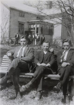 Adolf Ekholm, Arne Hurr, Edvin Östman 1924 som torde ha varit deras konfirmationsår. Ekholm omkom i mars 1925. i Bakgrunden gamla klockargården.