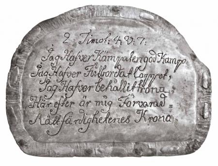 Kvevlax kyrka. Skriften på silverplåten hittades under kyrkans golv under renoveringen 1991. Plåten som härstammar från en okänd grav lades tillbaka..