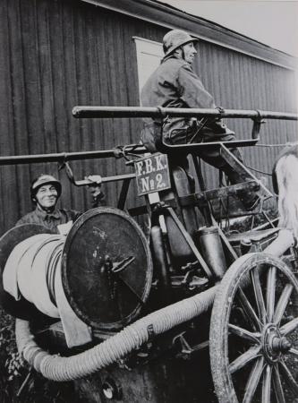 Gamla brandsprutan förs till sockenmagasinet (museeum) i juli 1976. Chefen för frivilliga brandkåren Gösta Ekman till vänster och Harry Hurr på kuskbocken. Foto Mikael Herrgård.