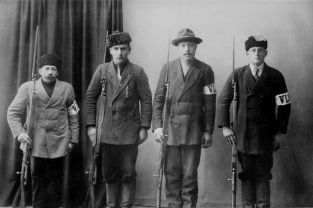 Bondesoldater 1918. Från vänster: Karl Enroth (Glasbäs Kalle), Kvevlax, Arvid Jakobsson, Kvevlax, Johannes Enlund, Österhankmo, Anders Udd (senare Uddström), Vassor.