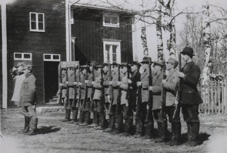 Skyddskårskurs för kvevlaxbor i april 1919 vid sockenstugan. Ledare jägarfänrik T Grunn och jägarfälväbel L Lax. Längst till höger Evald Knipström.