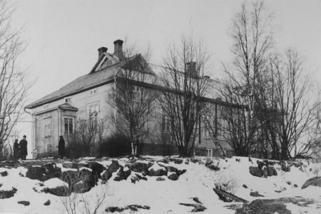 Kvevlax kyrkoby folkskola byggd 1905. Personerna till vänster: lärarparet Alexandra och KV Åkerblom, den andra kvinnan ej identifierad.