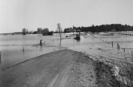 Översvämning 1956 på vägen söderut till Nabben. Här byggdes "Langbråoven" (kavelbro) på vattensjuk mark när vägen till Veikars och Vasa tillkom 1772. Ännu tidigare gick kyrkresorna här, med båt upp i Viken, och fortsatte genom skog och vattenfyllda träsk till Gamla Vasa.