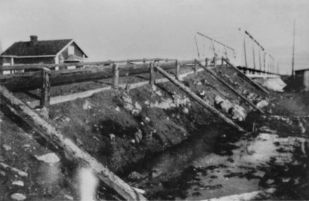 Färjstugan, samt vägen och nya bron (färdig 1935) över Kyro älv under byggnad.