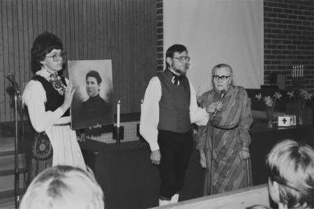Ida Hjortman (höger) överlämnar en bild av sin moster Ida Ahlskog till Kvevlax Missionsförsamling på söndagsskolans 100-års jubileum den 4 maj 1986. Idas son Daniel och fru Margareta assisterar.
