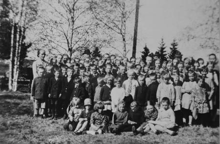 Friförsamlingens söndagsskola på utfärd till Österhankmo under senare delen av 1920-talet. Lärarinnorna Irene Paro till vänster och Linnéa Bergman (gift Ahlbäck) till höger. Männen bakom är Johannes Sandvik, Verner Finndahl, Johannes Enlund.