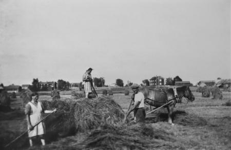 Regina, Estrid och Julius Hurr höbärgar ca 1950 i Överbyn.