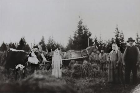 Tidig 1900-tals bild. Brita och Johan Sanders, Ester Jakobsson (gift Österberg). Norrgårds Joss och mosson med skäran till höger. Troligen Alfred Norrgård bakom kon. Sädeskärvarna sätts för torkning på störar.
