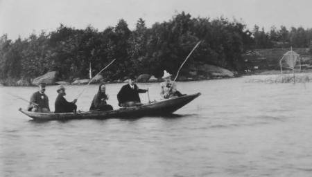 Folkskollärare Jakob Schulz (andra från vänster) med sällskap fiskar vid Oxholmen i början av 1900-talet.