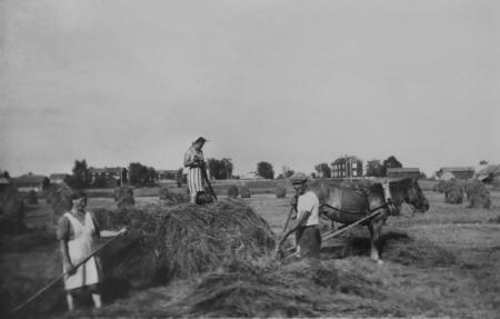 Regina, Ida och Julius Hurr höbärgar i Överbyn omkring 1950.