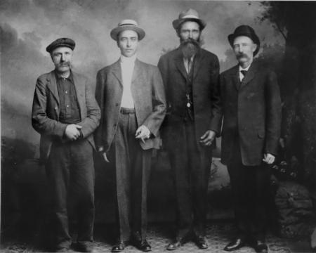 Gruvkompanjoner i Colorado under slutet av 1800-talet. Från vänster: Jan Malm, en namnlös advokat från Denver, Gus Carlsson, Gustav Plånman, far till Sandelins Gustav (Planman).