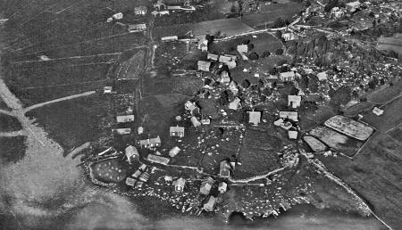 Flygbild från Skatan vid Kyro älv i Kvevlax 1931. Ett tiotal båtar syns i hamnen, Skatadjupet till vänster.