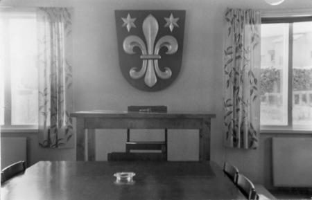 Från fullmäktigesalen i Kvevlax självständiga kommun. Fusion med Korsholm 1973. Kommunvapnet (1955-1972) planerades av heraldiker Gustaf von Numers och snickrades på Kvevlax manliga hemslöjdskola av slöjdlärare Gustav Nordman. Vapnet finns idag på Museum Magasinet i Kvevlax.