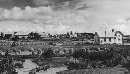 Kvevlax centrum från väster. Elimförsamlingens kapell till höger som byggdes 1937. Bilden är troligen tagen på 1940-talet.