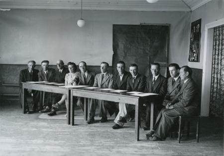 Kvevlax kommunala förtroendevalda i Sockenstugan före den nya kommunalgården togs i bruk1951. Kvinnan är hälsosyster Ester Norrgård (från 1941). Till höger om henne Alfred Botolf Nygård, förtroendevald i tre årtionde och kommunalstyrelseordförande till 1959 då han avled. Efterträdare på posten blev John Rabb som sitter till höger om Nygård.