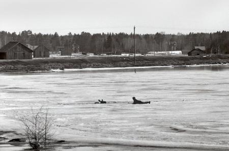 En älgko gick genom isen 23 april 1981 på Kyro älv strax norr om bron. Rolf Dahlqvist från frivilliga brandkåren gör ett räddningsförsök genom att fästa ett rep runt älgen, som dock skadades svårt av isen och måste avlivas. Dagen efter skedde islossningen på älven. Foto Mikael Herrgård.