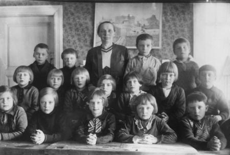 Lägre folkskolan i Kvevlax 1933. Lärarinna Signe Maria Antell (1896-1934). Uppifrån, vänster: Ragnar Burman, Birger Knip, Ragnar Fantdahl, Karl-Erik Jakobsson. Mitten: Vivi Norrgård, Nelly ..., Karin Nyman, Elli Hjort, Rafael Nygård, Sally Bäckman, Per-Erik Herrgård. Nere: Kerstin Nordman, Margit Holms, Gunnel Ahlskog, Els-Maj Kvevlander, Ruben Vörgren.