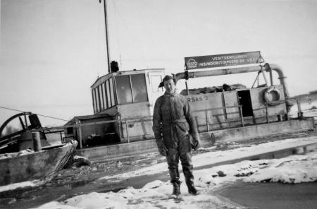 Alvar Finne i Österhankmo framför mudderverket under torrläggningen av Hemfjärden på 1950-talet.