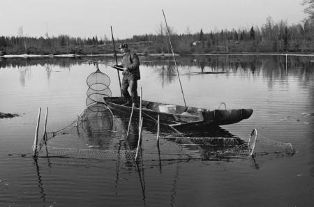 Alvar Finne (bror till Gunnar Finne) från Österhankmo fiskar med ryssja på våren 1982 i Kyro älv vid Braxgrund (mellan Vassor och Österhankmo). Foto Mikael Herrgård.