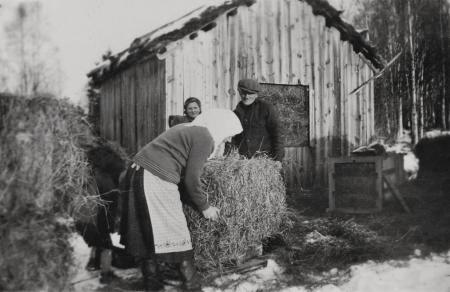 Höbalning hos Karl Vingård. I förgrunden Jussas Hilda, bakom Senni Henriksson (Örn).