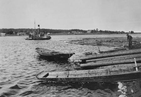 Rundvirke görs i ordning för flottning vid Vallin omkring 1930. Bogserbåten Hurtig sköter bogseringen ut till en väntande lastbåt på Pudimofjärden.