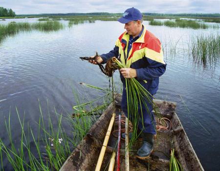 Henrik Westerback med blomvassrot (dobrarot) i Kyro älv vid Brändholmen-Österfjärden. Blomvassen (Butomus umbellatus) var tidigare vanlig i älvens nedre lopp och roten fungerade som nödföda under nödåren 1867-68. Ett litet bestånd växer fortfarande men den kraftigare Bladvassen tar över. Foto Mikael Herrgård.