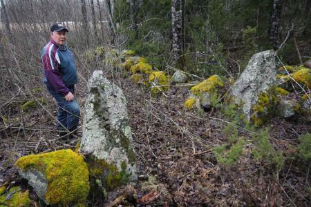 Henrik Westerback vid "Päraporten" 2012, ingången till de gamla stenröjda odlingarna i Päran. De är troligen Österhankmo bys äldsta åkrar, därom vittnar omfattande odlingsrösen i det numera beskogade området. Foto Mikael Herrgård.