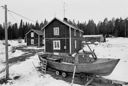 Fiskaren Bernhard Toppars hus och egenhändigt byggda transportbåt i Köklot 1979. Foto Mikael Herrgård.
