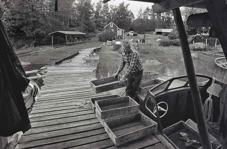 Fiskaren Johannes Back vid sin egen stuga och brygga vid Gårdarna på Mickelsörarna 1978. Foto Mikael Herrgård.