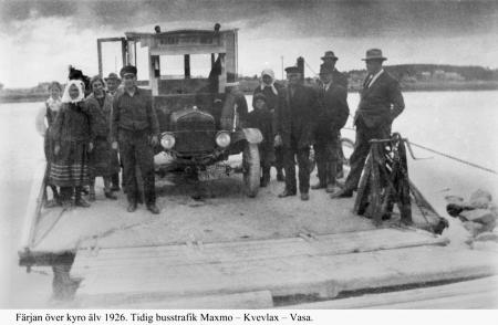Busstrafik Maxmo-Kvevlax-Vasa 1926, chaufför är Teodor Forsell. Färjan över Kyro älv är en ny lite större modell för att klara biltrafik.