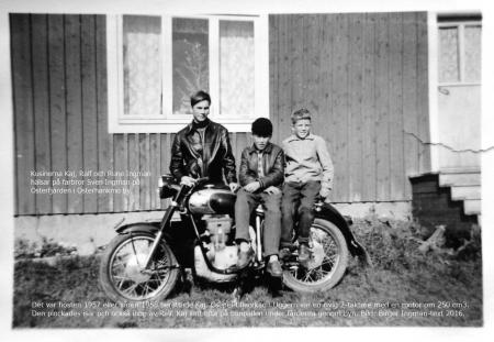 Kusinerna Kaj, Ralf och Rune Ingman i Österhankmo (1957 eller 1958). Motorcykeln: Csepel tillverkad i Ungern.