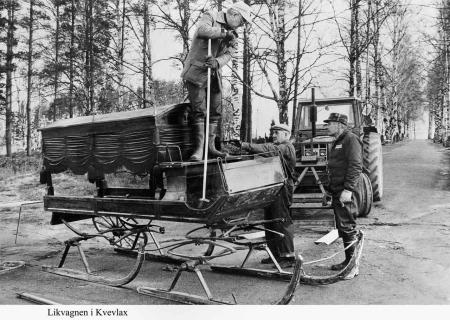 Den gamla likvagnen tas omhand och förs till kyrkans gravhus 1982 (från Biskopsholmens förvaring) av Erik Hagberg, Gunnar Svan och Alf Svahn. Vagnen fungerade året om, medarna byttes till hjul sommartid. Foto Mikael Herrgård.