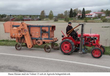 Hasse Ekman transporterar 2016 ett Agricola bolagströskverk till museal förvaring med sin Valmet 15. I bakgrunden ses Kvelax folkskola och lärarbostad, idag obyggt till Kvevlax stora lärcenter. Foto Mikael Herrgård.