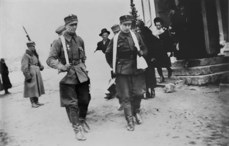 Hugo Knips jordfästning i Kvevlax 14 april 1940. De främre bärarna är Gunnar Hägglund (vänster) och Edvin Knuts. Bakom kistan föräldrarna Edvard och Ida Knip, samt systern Elvi. Samma dag jordfästes även Almer Östman, Kvevlax och Teodor Finne, Österhankmo.