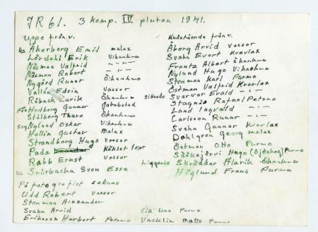 Bildtext för bild 17. Uppe från vänster: Emil Åkerberg Malax (Us), Erik Lövdahl Västerhankmo, Valfrid Näsman Västerhankmo, Robert Näsman Västerhankmo, Runar Nygård Österhankmo, Edvin Vallén Vassor, Gunnar Hedgerg Vassor (Fän), Thure Stålberg Österhankmo, Oskar Nylund (Serg) Västerhankmo, Gustav Hallin Malax, Hugo Strandberg Vassor, Ivar Pada Köklot, Ernst Rabb Vassor, Sven Snårbacka (Us) Esse. Knästående från vänster: Arvid Åberg Vassor, Evert Svahn Kvevlax, Albert Frantz Österhankmo, Hugo Nylund Västerhankmo, Karl Stenman Purmo, Valfrid Östman Kvevlax. Sittande: Evald Svarvar Kvevlax, Rafael Stagnäs Petsmo, Ingvald Lund Petsmo, Runar Carlsson Petsmo, Gunna Svahn Kvevlax, Georg Dahlgren Malax, Otto Östman Purmo, Sääksjärvi Hugo Purmo. Liggande: Alarik Skräddar Österhankmo, Frans Höglund Purmo. På bilden saknas: Robert Udd Vassor, Alexander Stenman, Arvid Svahn, Herbert Eriksson Petsmo, Uno Vik Purmo, Matts Vacklin, Purmo.