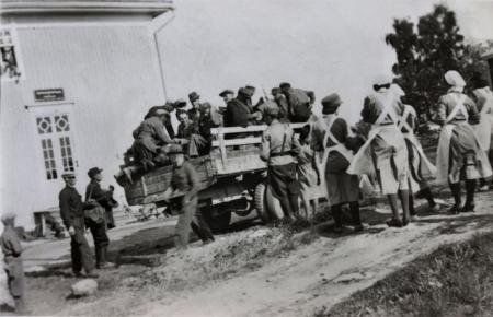 Avfärd till Jeppo station för inkallade den 18 juni 1941. Färden startade från slöjdskolans gårdsplan med Albert Ahlbäcks lastbil. Mannen med axelrem var dåtida militär underinstruktör Yngve Jungner.