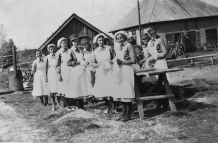 Färden för de inkallade till kriget startade från slöjdskolan 18 juni 1941 till Jeppo station. Hemmafrontens kvinnor skötte förplägnaden före avfärden. Vänster: Margareta Bergman, Aili Nygård, Aili Sand, Ines Kvist, Astrid Sandén, Mildred Nässlin, Rut Ingman.