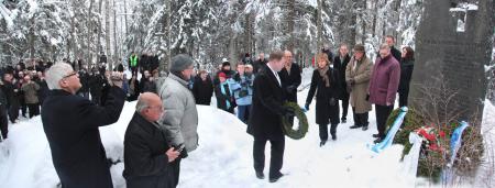 Kransnedläggning 2 januari 2011vid platsen för flygolyckan i Kvevlax 3 januari 1961.Tjugofem personer omkom när Aeros plan (DC 3) på väg från Kronoby till Vasa störtade vid ”Tränjonmaran”, 2,3 km söder om Kvevlax centrum. Vänster: Michael Jakobsson, Peter Boström, Anna-Maja Henriksson (Jakobsstad), Anders Lundström (Kvevlax), Lars Gästgivars (Korsholm), Johannes Hjortman (Kvevlax), Sverker Skogberg (Finnair). Linda Pada Korsholm). Till vänster Bo-Sanfrid Höglund (filmar), son till omkomne Sanfrid Höglund. Foto Mikael Herrgård.