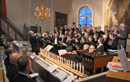 Det 50-åriga minnestillfället över flygolyckan i Kvevlax 3 januari 1961 hölls i kyrkan, Församlingshemmet och på olycksplatsen 2 januari 2011. Ekumeniska kören sjunger under ledning av av Yngve Svarvar. Foto Mikael Herrgård.