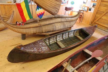 Läraren Yngve Rydströms (1915-1991) intakta näverkanot som han byggde 1941 vid Svir under kriget. Rydström var ivrig seglare och byggde åtminstone en segelbåt i Österhankmo där han var lärare 1947-1962. Kanoten finns på Kverkens båtmuseum i Malax, här tillsammans med vassbåten från Sydamerika och den urholkade trädstamskanoten från Afrika. Foto Mikael Herrgård.