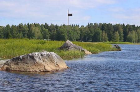 Korsformade farledsmärken i Kyro älvs nedre lopp mellan Vassor och Tottesund från början av1900-talet. Nätören mittemot danspaviljongen på Gubbholmen i Maxmo. Ena korsarmen finns kvar på märket. Foto Mikael Herrgård 2019.