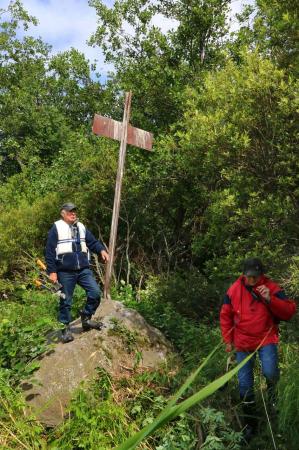 Korsformade farledsmärken i Kyro älvs nedre lopp mellan Vassor och Tottesund från början av 1900-talet. Lakagrynnan i Vassor. Yngve Svarvar och Viking Åberg dokumenterar märkena. Foto Mikael Herrgård 2019.