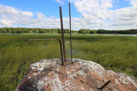 Korsformade farledsmärken i Kyro älvs nedre lopp mellan Vassor och Tottesund från början av 1900-talet. Sandören i Vassor. Järnfäste efter stolpe (el ?). Foto Mikael Herrgård 2019.