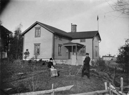 Klockaren Johan Vilhelm Hanelius (1854-1900) vid sin gård i Kvevlax. På bilden tillsammans med hustun Anna, som inrättade fotoatelje efter makens död.