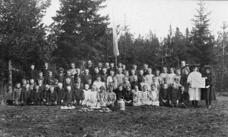 Kvevlax folkskola 1911. Utfärd till Brokärr med lärarna Alexandra och KV Åkerblom. Sonen i Åkerbloms famn är antagligen Bror (f.1908). Mannen till höger med fiolen är troligen Viktor Ahlskog (vikarie 1911-12). Skylten som de bekransade flickorna håller är inte läsbar. Brokärr ligger ca en km nordost om skolan i ett naturskönt område med dåtida små odlingar. Idag är de beskogade men skolan uttnyttjar fortfarande områdets många motionsstigar utgående från Tranasbacken och sportplan.
