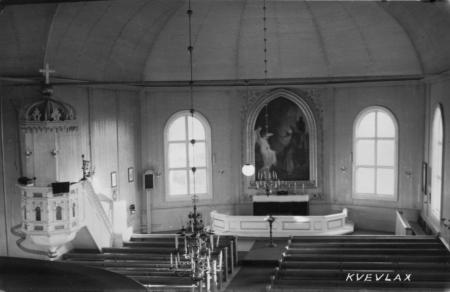Kvevlax kyrka på 1950-talet medan predikstolen ännu var övermålad med vit färg. Originalfärgen återskapades i början av 1960-talet.