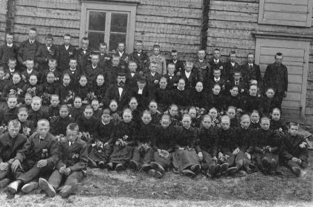 Skriftskolan i Kvevlax på 1890-talet. I mitten klockaren Johan Vilhelm Hanelius (1854-1900) och kyrkoherde Klas Edvin Karsten (1836-1908).