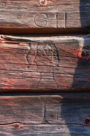 Inristningar på fähus (föuse) från Överby i Kvevlax uppfört ca 1880 (vid Stundars sedan 1975). På fähusets baksida finns ett hundratal fina bevarade ristningar med initialer och ett mer berättande bildspråk. Foto Mikael Herrgård.