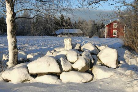 Fornminne, råröse i Överbyn, Kvevlax. Röset härstammar från nyskiftet på 1930-talet. Intill fanns Blombergs bondgård. Foto Mikael Herrgård.